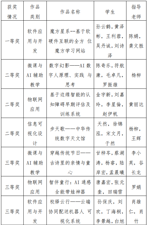 陈娟老师等指导,孙云鹤、黄泽彬、王利蓉、吴丹诚和刘诗泽同学协同创作的作品《魔方星系--基于软硬件互联的全方位魔方学习网站》荣获软件应用与开发类一等奖。